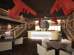 Просторный зал рассчитан на 60 посадочных мест, декорирован различными интересными деталями; например, такими как, большие красные пистолеты. В зале есть диско-шар, большая барная стойка, диджей.
