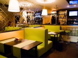 Зал заведения рассчитан на 50 мест, здесь можно проводить банкеты и свадьбы с приглашенными гостями количеством до 45 человек. Интерьер выполнен с использование салатового, стального и коричневого цвета. В зале есть также барная стойка.