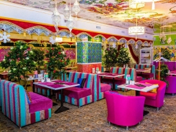Шесть уютных залов, каждый из которых по своему не повторим и красив. Все залы оформлены ярко, красиво и неповторимо. Здесь отслеживаются нотки востока; мягкая мебель, роспись на потолке, яркие обои - все радует глаз.