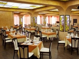 Просторный и светлый зал рассчитан на 250 посадочных мест. Интерьер выполнен в европейском стиле в золотистых цветах. Если Вы хотите собраться небольшой компанией, посидеть в тёплой дружеской обстановке вдали от посторонних глаз Вам будет предложена небольшая, уютная банкетная комната, рассчитанная на 20 перcон.