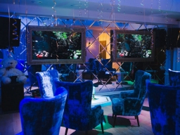 Зал рассчитан на 40 посадочных мест. Оформлен в современном стиле, в зале много зеркал, мягкие кресла. Интерьер выполнен в синем цвете, а стены в светлом.